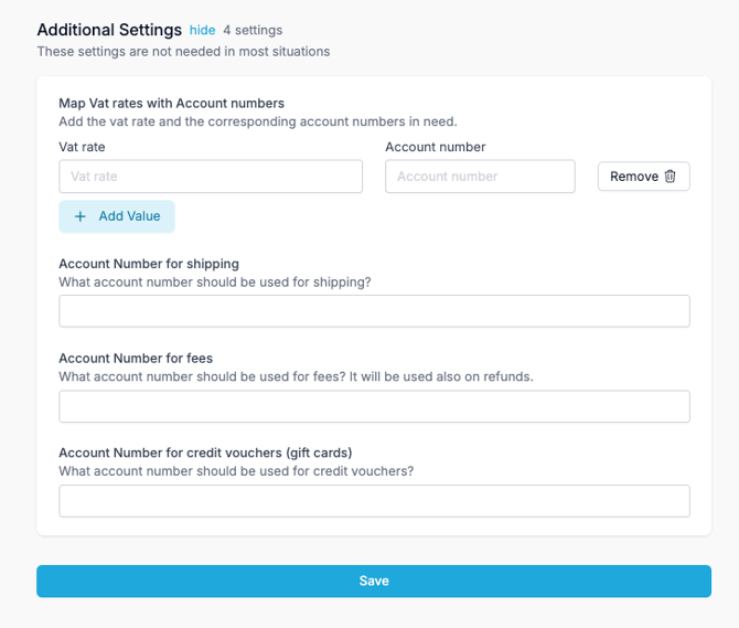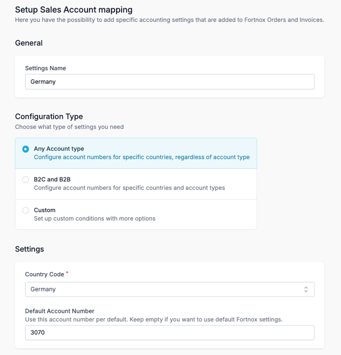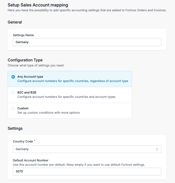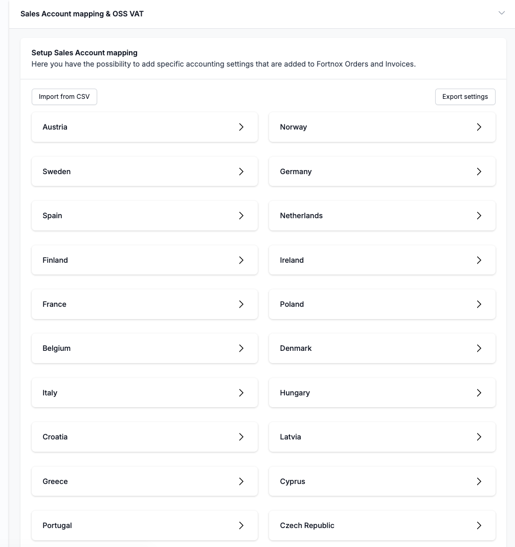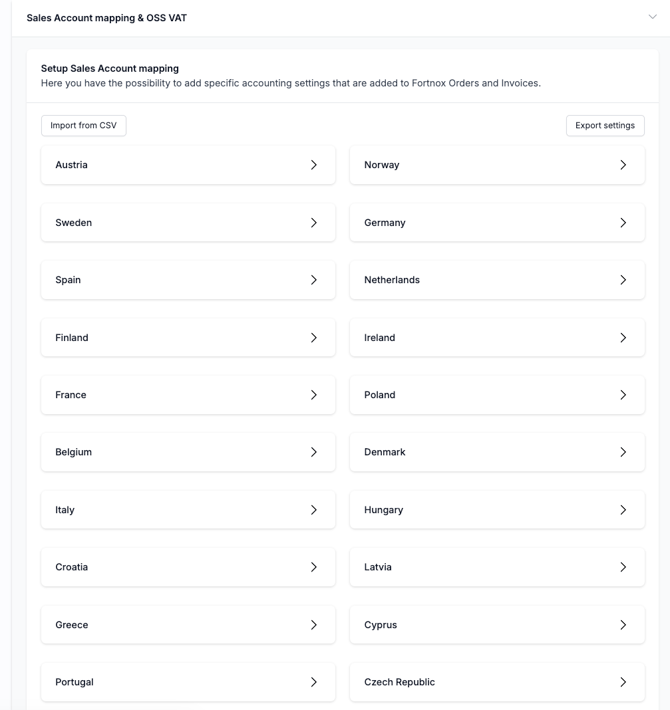 In the Fortnox settings this is where you can manage the sales accounts mapping for OSS or for any other reason, ex B2B, B2C, Markets etc.